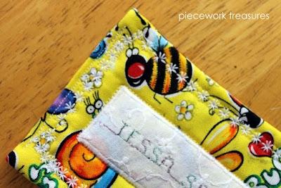 When my daughter, who is now nearing 20 years old, was a baby, a friend of mine gifted her with a quilted baby nametag (photo below) perfect for attaching to her diaper bag.   My daughter was too little to care, but I loved this!  Today I found it squirreled away with some of her childhood momentos in a special box she keeps in her closet...