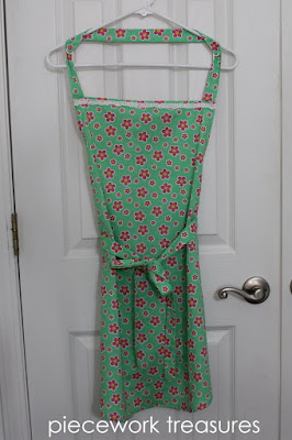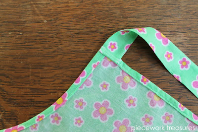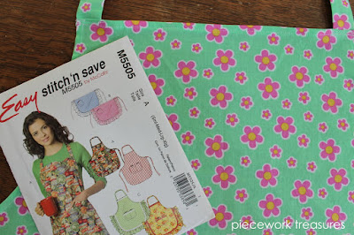 All raw edges were serged and turned in twice so even the serged seams don't show.  This gives the apron a nice finished look.