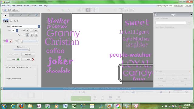 Now, using Picasa, open your blank 'picture' and it's ready to be edited.  This is where the fun begins!  Open the 'Edit Text', you can choose your text color now or later.
