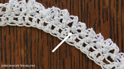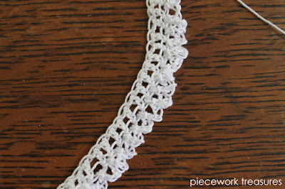 To attach it to your project piece it could be hand stitched or using your sewing machine with matching colored thread, straight stitch through the ch stitch, then another straight stitch through the dc ch stitch.  The machine stitching literally disappears leaving the filigree openings and picot-like edges free to give it a little lacy look.