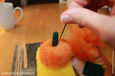 Place the stem at the top of your pumpkin shape, and felt it into the pumpkin by moving your needle in and out of the bottom of the stem and into/through the top of your pumpkin all 'round the bottom of the stem. This will attach the stem to the pumpkin. Keep felting this way until it has the 'look' you want.