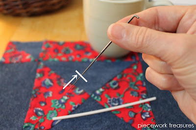 The needle only goes into the wool the depth of where the burrs are on the needle. Check the photos above for reference - but @ 3/4" from the bottom of the needle. The craft stick can be used to hold the fiber in place as you felt with your other hand. After I got the hang of it, I was able to put my craft stick away and use my fingers - always conscious of where my felting needle was going.