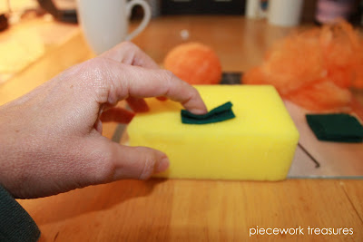 Let's work on the pumpkin stem now. Using a pre-purchased green felt sheet from a fabric store, cut @1 3/4" x 1 1/2" piece. Notice I'm still using the magazine with the sponge on top.