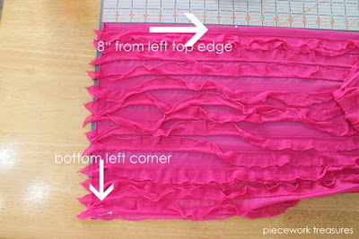 I cut mine 13" wide from selvage-to-selvage.  A selvage is the pre-finished end of fabric.  Just be careful you get the ruffles out of the way.... you want to cut between the ruffles, not through any of them.   Leave the selvage, it's a perfect finish and the ruffles cover the edges anyway.  At this point you should have a 13" wide by 60" long piece of fabric.