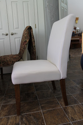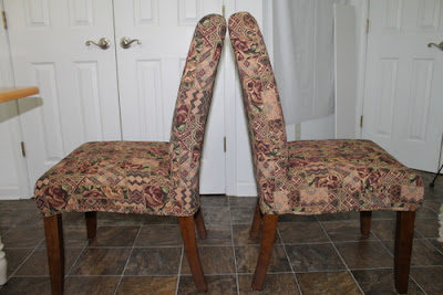 I've also been reading a lot lately about fitting patterns and fabric in garment sewing so took those thoughts to my chair(s) and ditched my pattern, that I sincerely hope I did not pay $15.95 for, and began to wing it. My fabric measured 58/59" x 72" and by cutting my fabric in half (@29" x 72") I could tell it'd (barely) be enough for each chair. Turned my fabric inside-out, draped and began to pin. Where my pins were would be my seam, so did not have to worry about seam allowances.