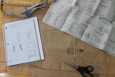 Took the time to meticulously cut out all 8 corresponding pattern pieces, read the directions, sketch my chair, then draw the pattern pieces out on my fabric because I only had 2 yards.... and that was IT...