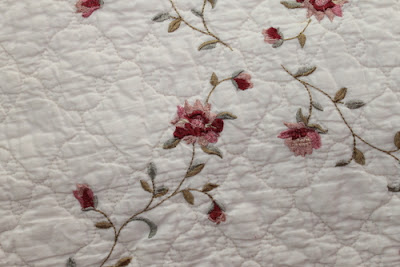 My sewing room also doubles as our spare bedroom and look how it coordinates with the bedspread quilt motif/colors below.