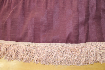So I thought about a contrasting strip of fabric/hem out of this coordinating silk/satin I had from some old window treatments I made yearsssss ago. I wanted a clean look and not introduce another color, even if it coordinated well. So, how about the fringe? I could unpick it and had plenty and it coordinated too.