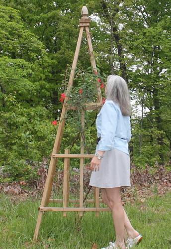 Folks here call this 'Woodbine', but being from Alabama, I'm more partial to its other known name 'Alabama Crimson Honeysuckle'. Odd, in that it has no smell.... at all. Quite beautiful growing on this trellis my husband made.Handmade Skirt: