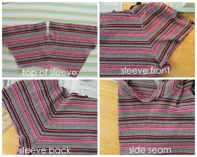 Also, after sewing the sleeve per the instructions, (see 'top of sleeve' in the photo collage above for a view of the slit) I decided I didn't want the 'slit' after all, so I slip-stitched that closed. I like this better for my shaped arms.