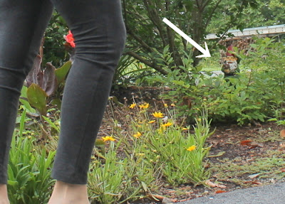 Changing the subject..... have you been able to spot my little friend hanging out at the base of the Rose of Sharon?