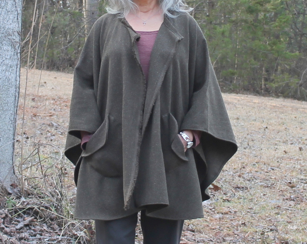 In the photo below, the back was very voluminous, so I took it in a little. Still learning the vocabulary and not sure what to call what I did.... pleat? It gave the poncho a little more dimension/definition in the middle back, as you can see by the way it is hanging on the hanger here.