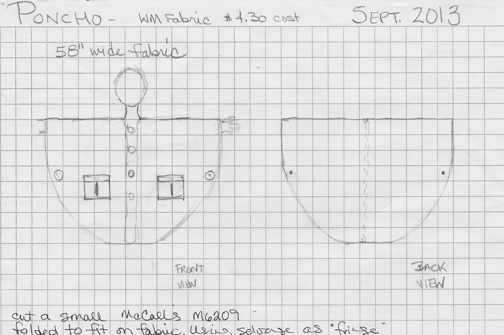 Years, and years ago, I had a poncho I loved and decided I wanted to create one for the casual lifestyle I live today. First I drew my plans on a piece of graph paper. This has been a great tool as I've referred back to this simple drawing time and again to keep me on track of my 'vision'. Also, note that the fabric came from Wal-Mart and cost $4.30 and was a gracious plenty wide at 58". This was the perfect width for my poncho, as I used every-single-bit, including the selvages - these turned out to be the icing on the cake!