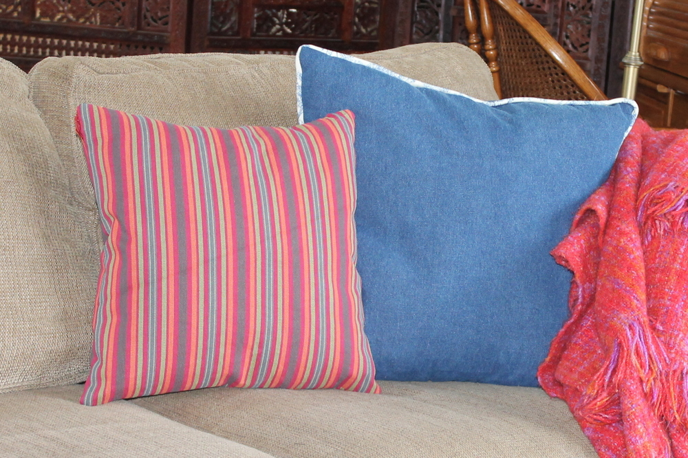 The cotton duck canvas fabric seemed to have been waterproofed on the 'wrong side', so the pillows were supposed to be for the two deck wrought-iron rockers.  But my husband and daughter both loved them here.... so here they are.  I used the pillow inserts I'd made for the Christmas pillows, so this was a fast 'n easy project.
