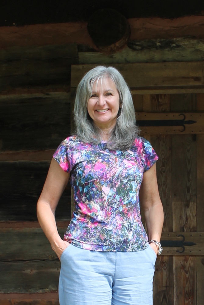 For the 2nd top, I used a multi-colored rayon spandex knit from Joann's and cut a small on top, flaring to a medium from the waist down, so this top gives me a little more 'fitted' look.  Still wanted the 'cap sleeve' look, only hemmed the sleeves a mere 3/8".   This fabric is totally different than the white knit in both feel and drape.  I love it too!  These photos below, this day, were taken at an 1845 restored historic mill.