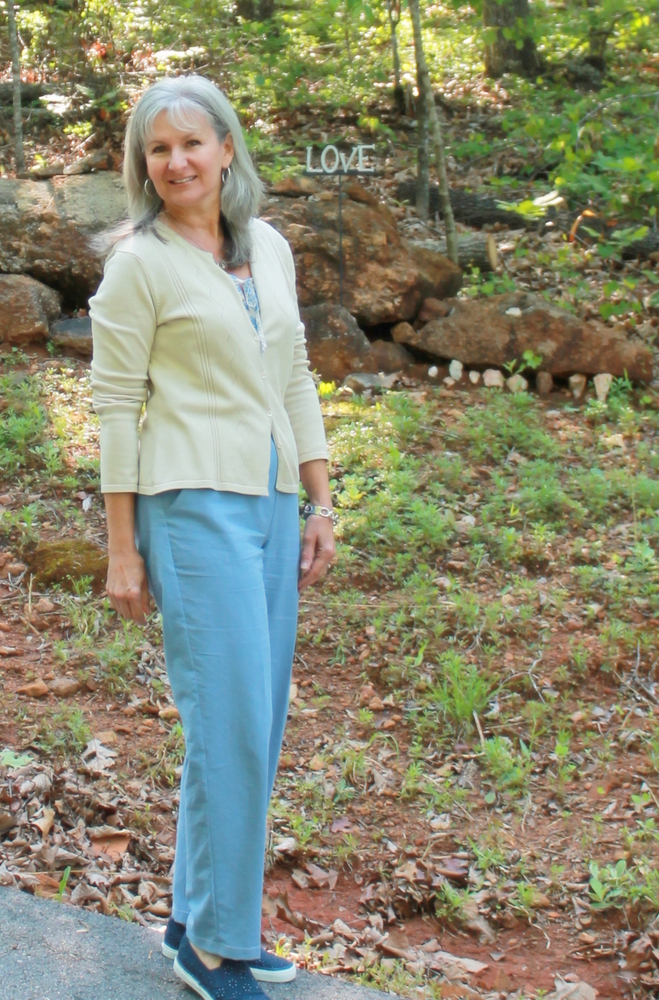 I've missed a few days of Me-Made-May, but gardening all day on Day 23 in 92 degrees heat did not lend itself well to photographing and Day 24 was spent about the same.   A second (unblogged) Kirsten Kimono Tee has been completed that I am wearing with the (unblogged) NEWLOOK 6246 elastic-waist pants.  Think I'm about ready to up my sewing skills to tackle a zipper and waistband pair of pants because I'm about ready for a more 'fitted' fit.  These are looking a little baggy-ish.  They are really comfortable though.  My husband kindly took my photos for me today.