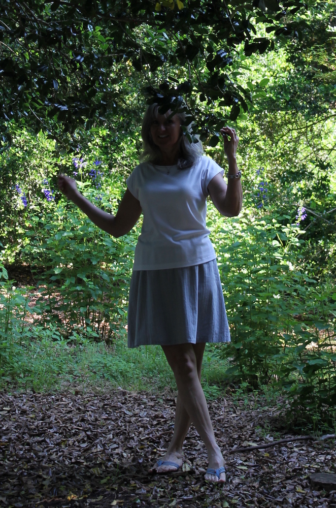 Here I am standing under a couple of magnolias whose limbs formed the most beautiful arch with gloriously blooming blue salvia behind me, in the sun.