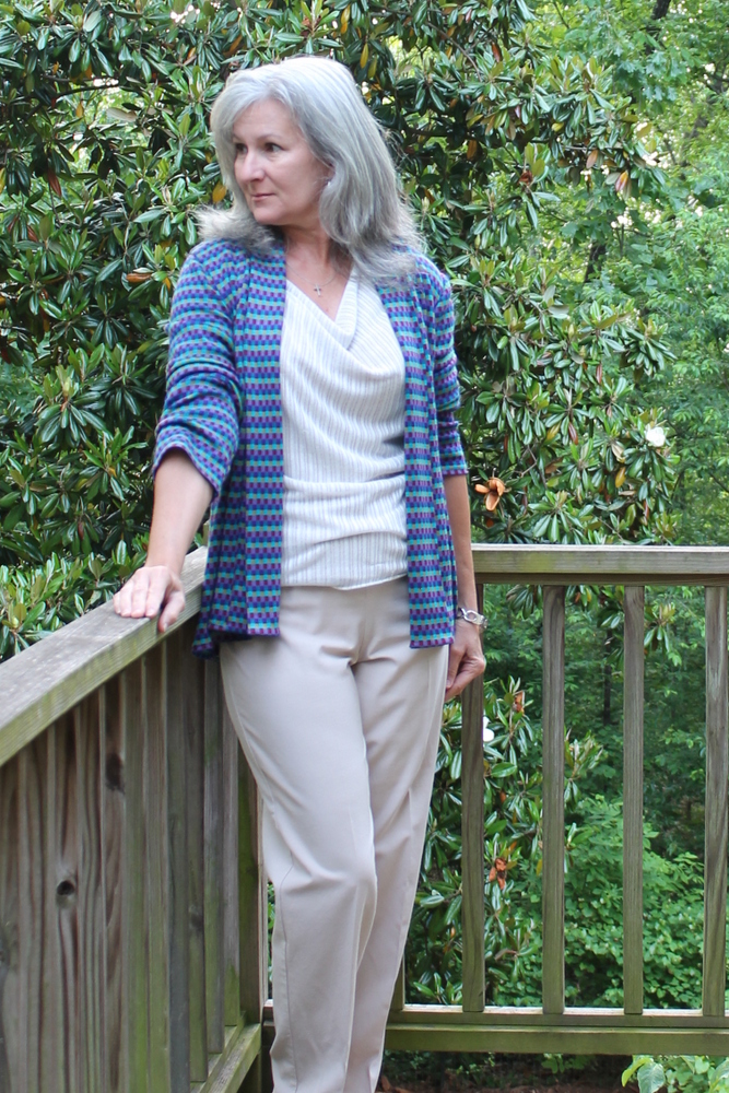 Because I am trying to be oh-so-truthful here, in the photo below is actually how I looked as I walked out the door early this morning. Yuck! And to think I wore this cardi with this pretty monotone outfit all...morning...long. Gee Whiz!
