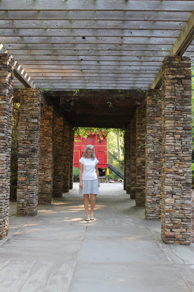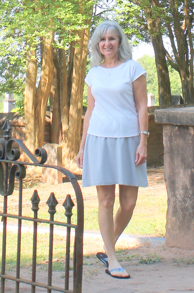 My me-made clothes are now in the repeat phase and I'm sure boring my sweet readers, so this morning was spent on my daughter's beautiful college campus to give me an opportunity to try out different backgrounds and lighting and to *gasp* take my photos in public! She was busy with class, so my tripod and self-timer were used with the camera settings on 'Auto'. Let me tell you, it still feels strange to take photos on my own land, so I thought long and hard about taking my photos in 'public'! As it was already sweltering, ridiculously hot at 8:00 this morning and feeling a little nervous, I decided to go easy on myself and wear the oh-so-soft white unblogged Kirsten Kimono Tee with the light gray NEWLOOK 6192 elastic-waist skirt with my flip-flops. We had 92 degree temps yesterday with the same forecast for today.