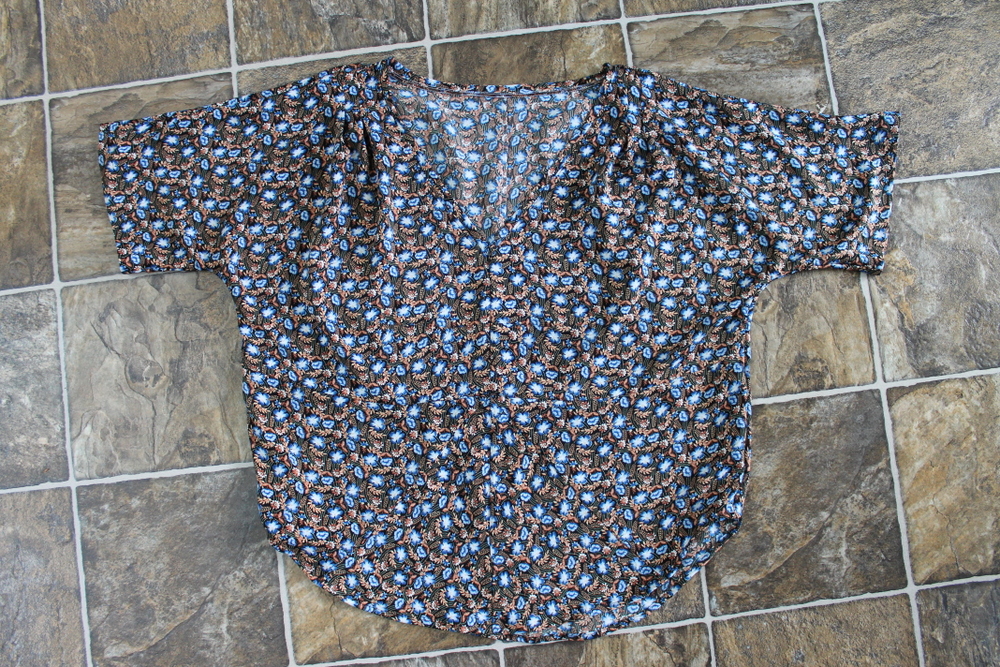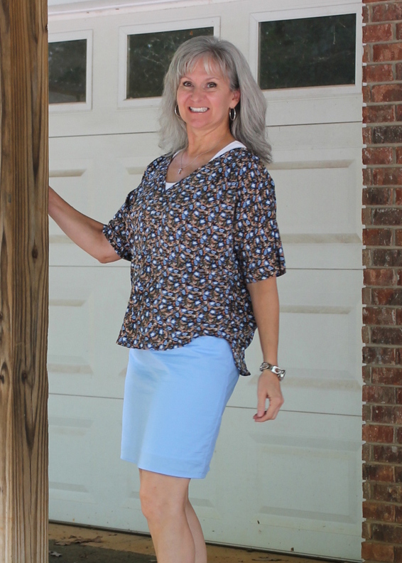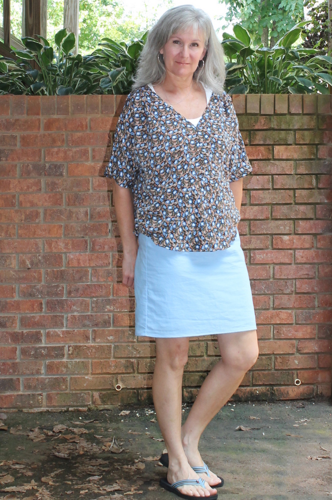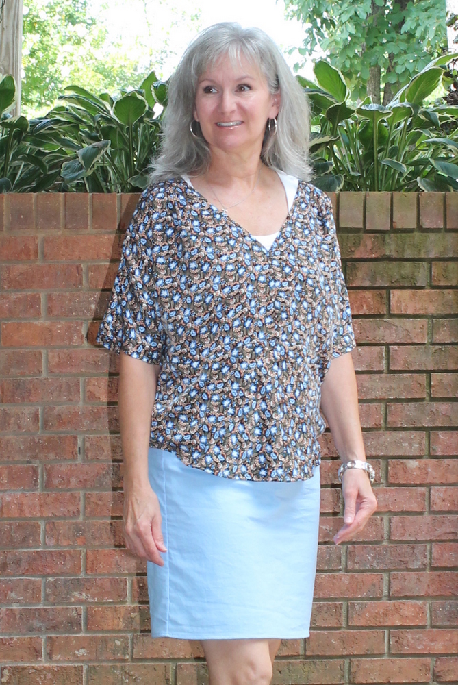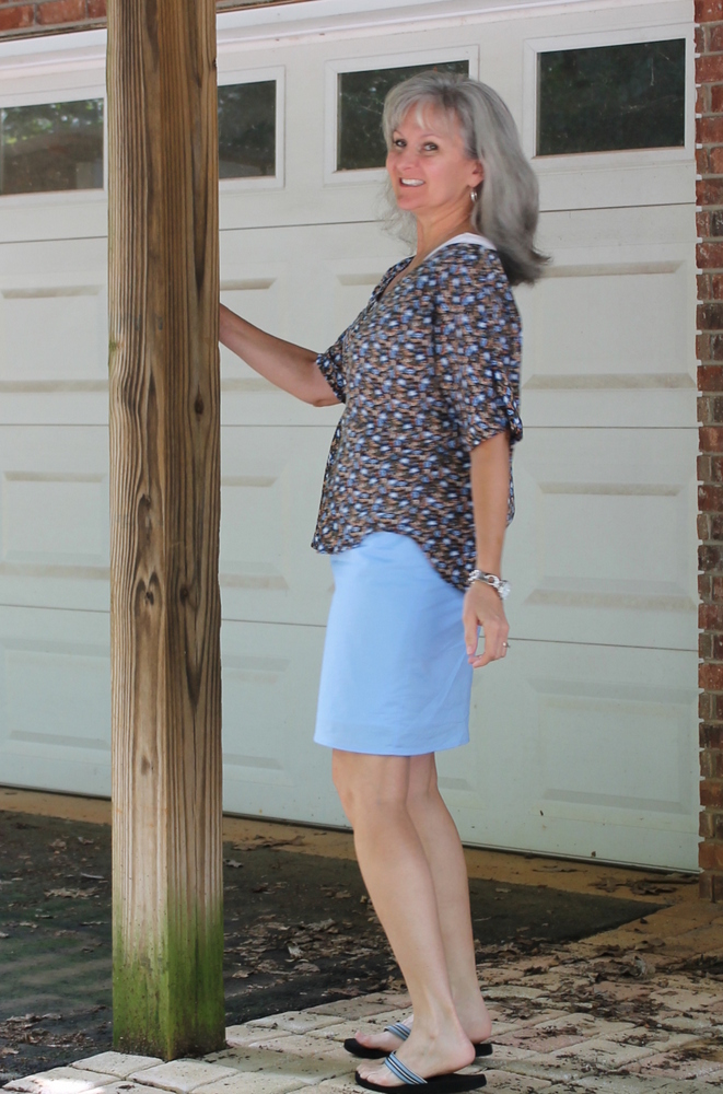 Now let's talk about the little straight skirt.  For as much as I did NOT like this the day I made it, I now LOVE it!!!  I've already worn it a full day, including out to dinner, and found it comfortable and easy to wear.  It is perfect with this flowy top.