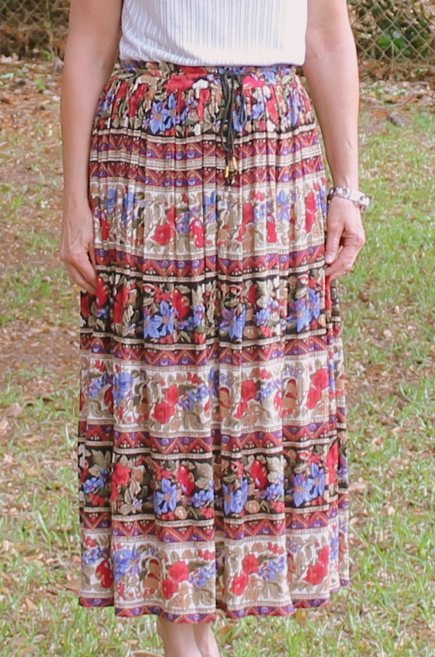 It's a flowing, elastic-waist skirt and I think if I simply lengthen it substantially, it should give me a peasant skirt look.....