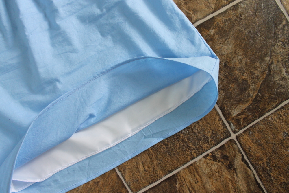 Shannon, at MushyWear, was my inspiration for my skirt as she's talked so much about making her skirts from a simple yard of fabric, sewing the elastic to the fabric top, turn down and stitch.  So, I had some blue woven cotton leftover from recent pants, measured the length I wanted, added in for the 1" elastic, cut a rectangle, serged the sides and the top (and lining at this point), turned down and made a casing then stitched and ran my elastic through.  I was nervous about sewing the elastic straight to the skirt fabric as I sometimes like to 'shift' the elastic around in the casing to fit the curves of my body.