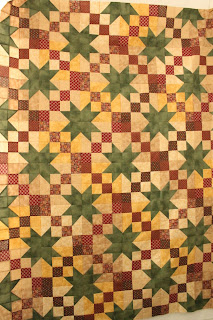 Thought it'd be fun to compare my top, photo below, right, to Karen's beautiful quilt, to the left... my inspiration.  It was tight quarters taking the photograph, so it looks a little cut-off and uneven.  Right now my quilt measures @48" x 64", which is plenty big enough for a lap quilt.... but am thinking about adding a 2 1/2" solid chocolate brown color border before moving on.  I like Karen's double solid color interior borders and think that might finish mine off nicely....