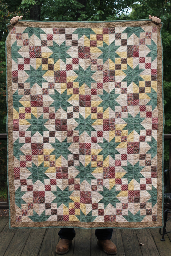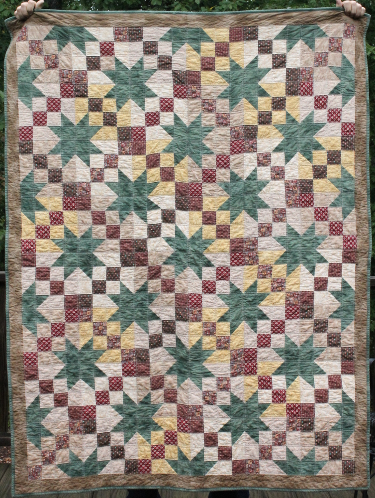 It was nice to travel down memory lane and think of all the good times with my cousin as I worked on his quilt and can hardly wait to surprise him with it soon!  May I again thank Karen for sharing her beautiful inspiration quilt and Gourmet Quilter for her video on piecing this block using 2 1/2" squares...