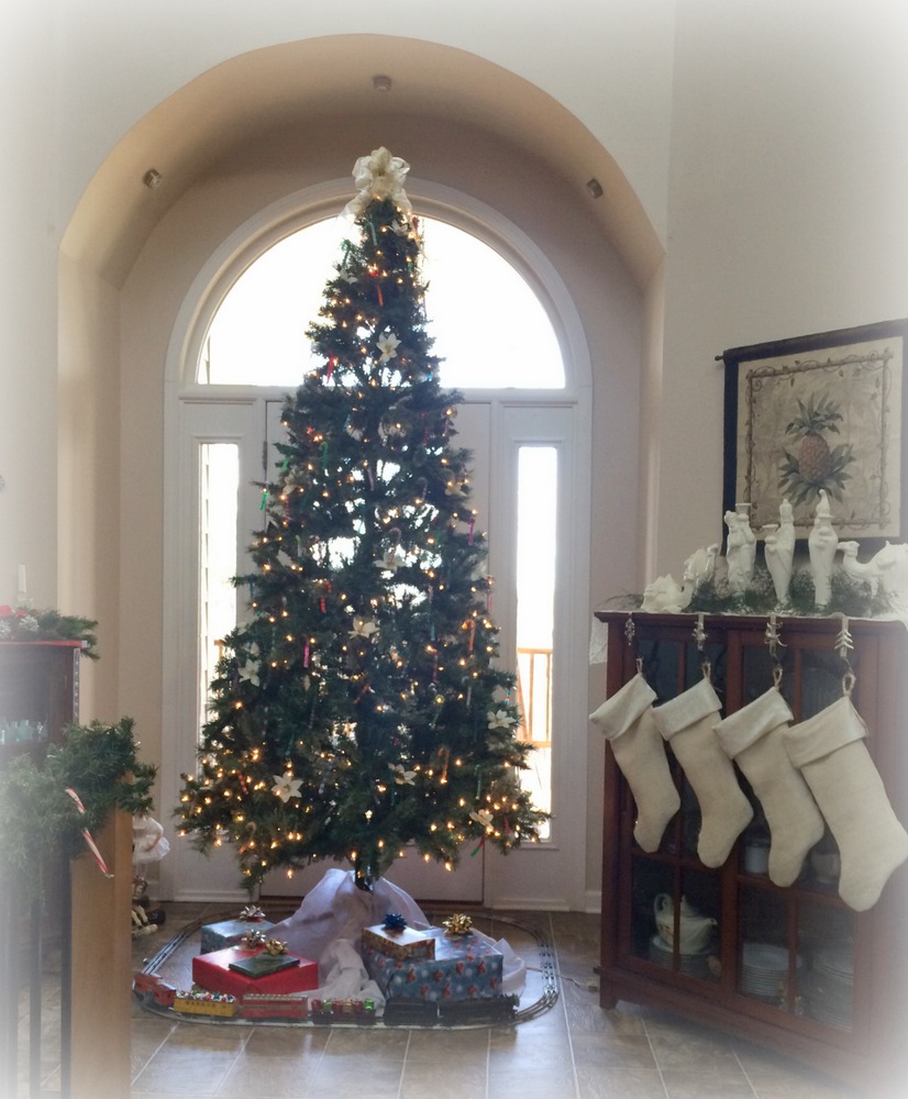 Welllll, we have a chimney... that is attached to our wood-burning fireplace..... that we use a LOT..... so these stockings are hung by the china cabinet near the Christmas tree so our house might not burn down. :)