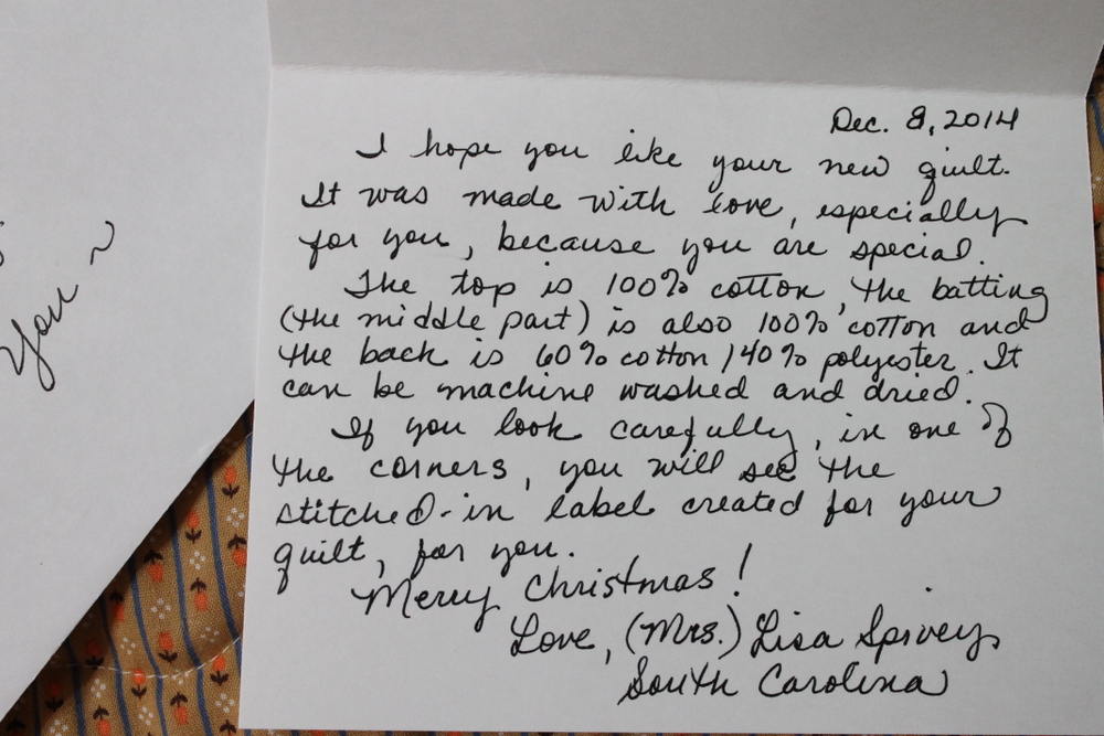 Remember, this quilt will be going to a children's home in Alabama, so this is the handwritten note I'm including again this year. It reads: "I hope you like your new quilt. It was made with love, especially for you, because you are special. The top is 100% cotton, the batting (the middle part) is also 100% cotton and the back is 60% cotton/40% polyester. It can be machine washed and dried. If you look carefully, in one of the corners, you will see the stitched-in label created for your quilt, for you. Merry Christmas! Love, (Mrs.) Lisa Spivey / South Carolina"