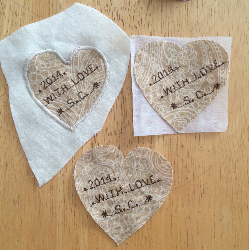 Then the frustration(s) began.  Having already prepped and pieced together cream-colored flannel from the stash for the backing, I noticed a small stain.... on the flannel.... the flannel I had pre-washed.  I knew the stain would not come out.  What to do..... what to do.  Aha!  The quilt label could be stitched over the stain (in the middle of the back) and become a 'design element'.  Yes! I quickly made a perfect 'heart' label using the embroidery feature on my machine for the wording.  The label on the left, photo below, turned out perfect and was immediately satin-stitched to the flannel, where I now began to worry about the integrity of the flannel fabric.  With every needle stitch, there was a hole.  It reminded me of a flannel pair of pajama pants I made for my daughter last year where, within a few washings, the flannel ripped.  Not the seams... not even at the seams..... but within the flannel itself.  Certainly not wanting that to happen here... trashed the flannel and started over.... which meant I could not use the perfect label either.  Thinking that while I had the label mojo going I'd go ahead and make another label, which turned out terrible - photo below, top right.  Third time being the charm, and an hour later, the next one turned out fine... photo below, bottom.  Some of my frustrations this day were shared on Instagram.