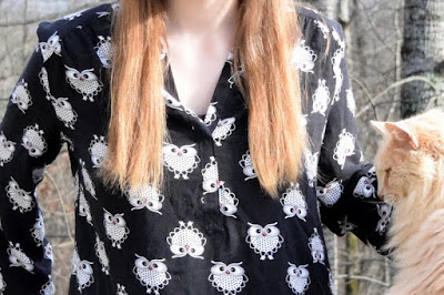 The rain stopped (yay!), with sunshine and blue skies emerging, it was determined a great time to take photos of Melissa in her new owl shirt.  Buster the Cat wanted to be a part.   She never asks me to make her anything, other than pajama pants, so this shirt was a surprise for her fall birthday.