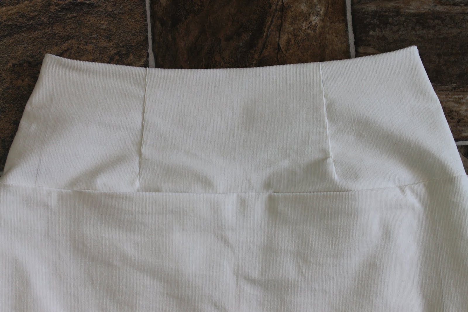Construction details:  Took a little bit more time, but I made a master pattern out of interfacing for this skirt and REALLY like using that so much more than the paper patterns.  My pattern only went to a size 12 and my current measurements put me larger than a 12, so I added 1/2" to side seams of the 12 and added 4" to length.  Sewed/serged with a mere 1/4" seams.  5/8" center back seam and took in a little more at the darts..... particularly the back darts.... and 1/4" on both sides.  I will probably cut the size 12 next time as this one is a little too loose around the waist.  Construction photos show the deleted waistband.