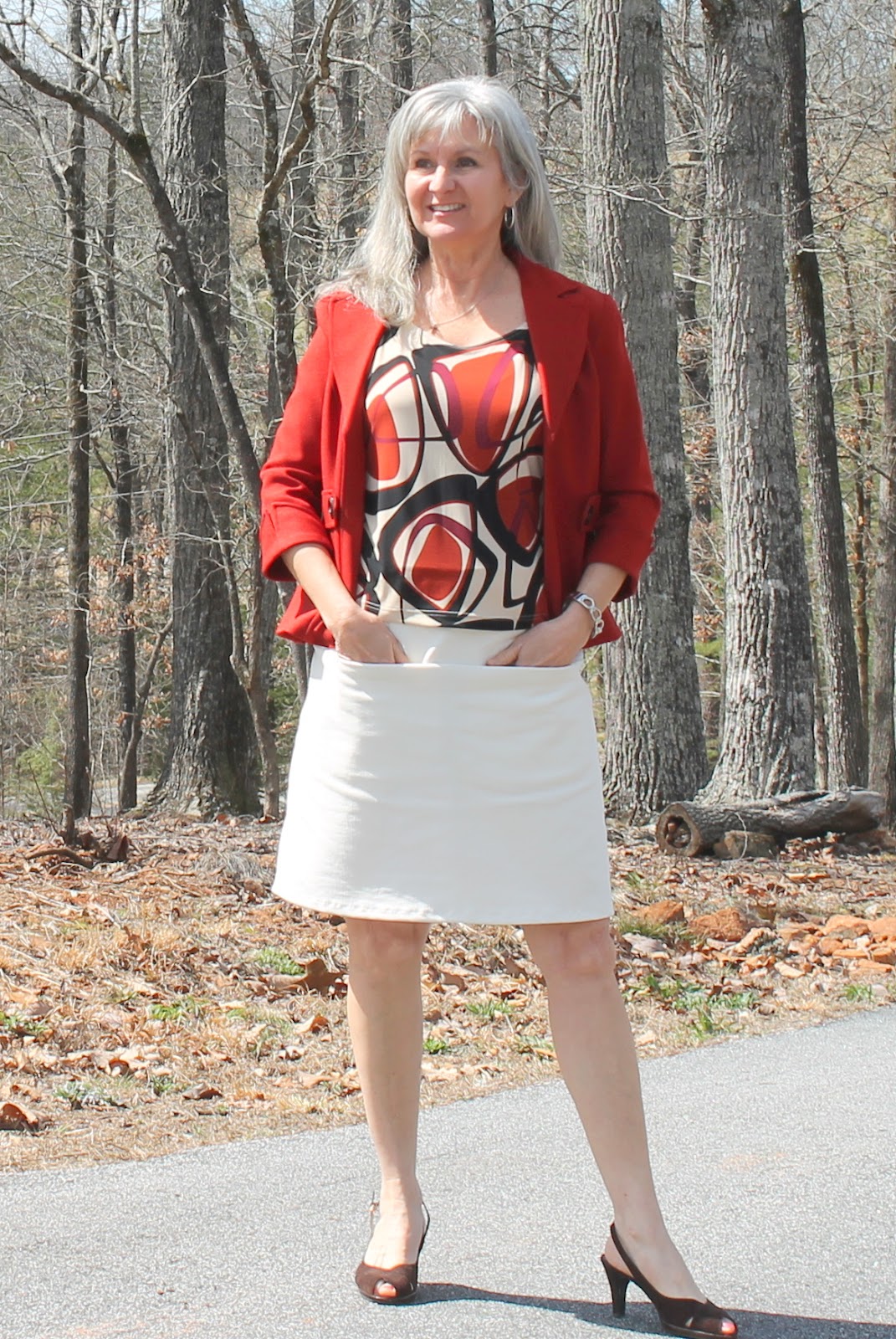 The back.  This little rtw jacket works perfectly with this skirt on a couple of different levels.  One, the rust color against the cream corduroy is a nice contrast.... but also this little skirt has horizontal seams across the entire backside, and since my um, er, 'backside' is already a little um, er, prominent.... wasn't sure the seams were what my figure needs.... ya' know.... don't want to bring any more attention to an already troublesome spot :), so the jacket covers it nicely.  Also my zipper wasn't the best zipper application..... so it's nice to know that's kinda' covered too.