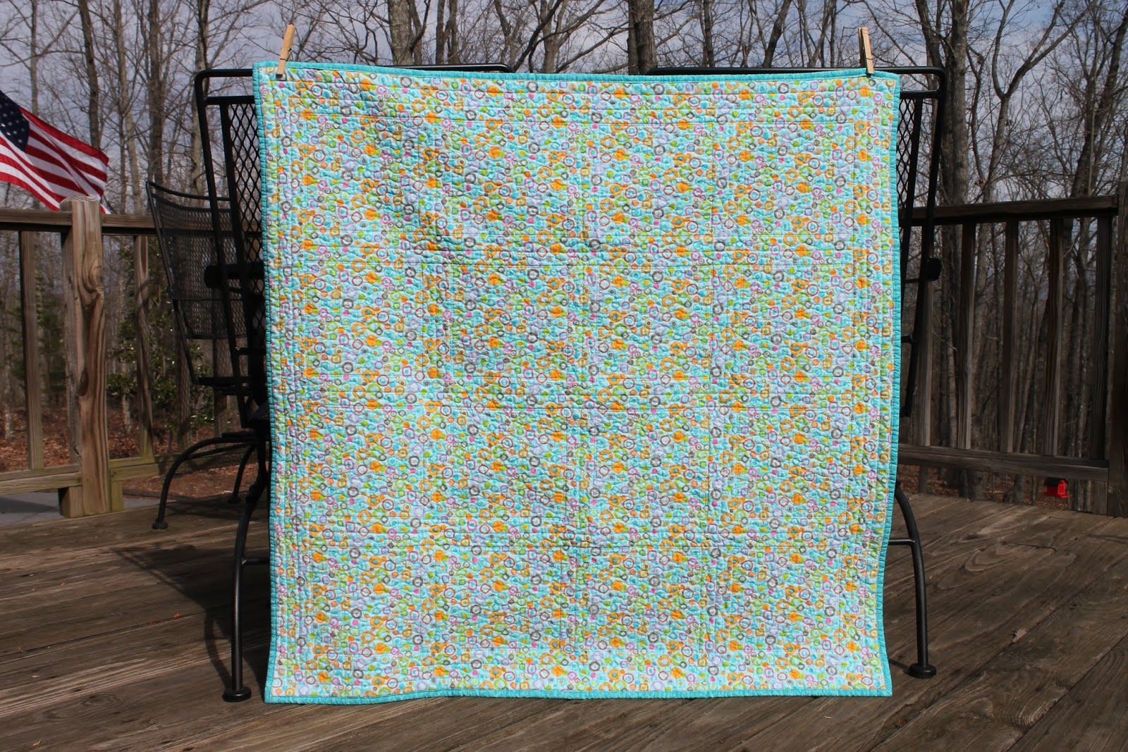 And what a pleasure to work on these colors of Spring as the winter storms passed through our area.  Before washing/drying the quilt measured 40 1/4" x 40 1/4".  After washing/drying (as you see here) the quilt measures 38" x 38 1/2".
