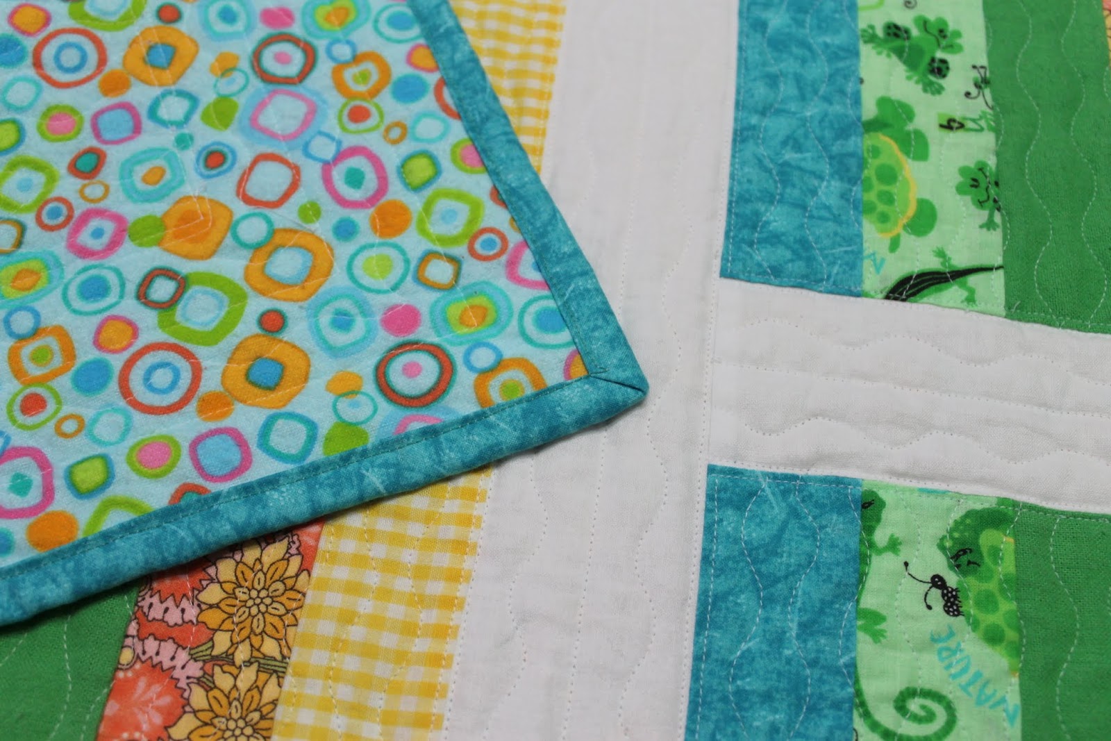 For this quilt used a new binding technique that I LOVE!  You can see the video here.  Project Notes:  cut binding strips 2 1/2" wide, sew to front first, no pressing, pin sideways, stitch in the ditch in the front catching the back.  Go slow and this is the best machine stitched binding technique I've found.