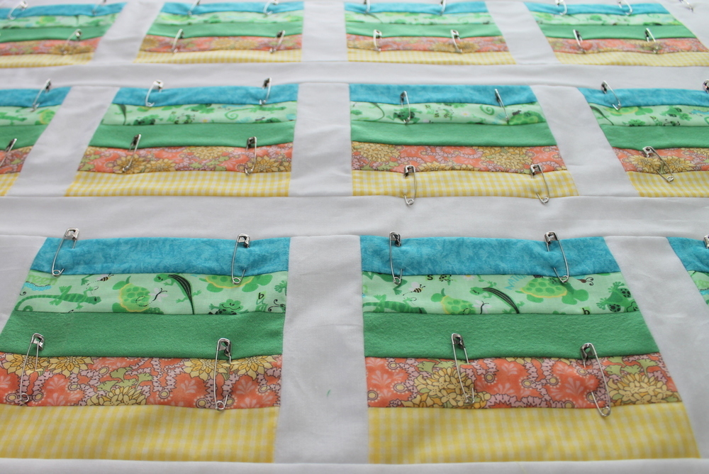 One of my pieced blocks show the sky, happy critters frolicking in the green grass, soft earth and daffodils.  The strip representing the 'green grass' was a flannel from my stash that I had wondered why in the world did I buy a solid color green flannel fabric?!   It worked perfectly in this quilt and this piece being flannel adds a bit of texture to the front.  All the other fabrics are 100% cotton and the batting is 100% cotton.