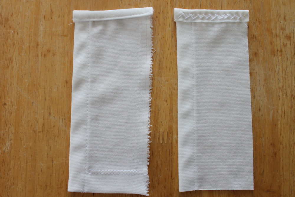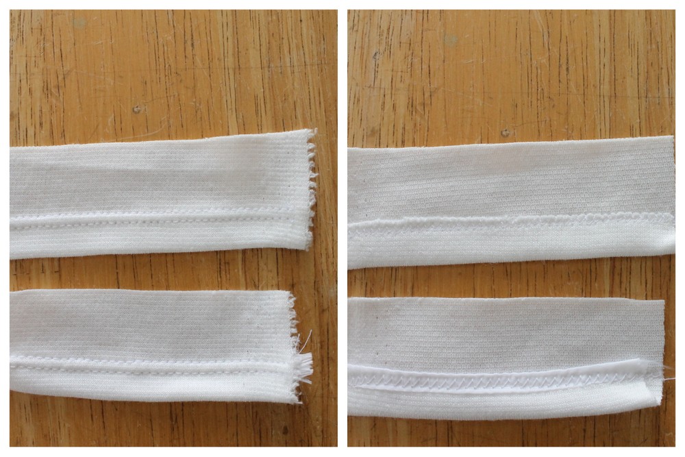 A few of my samples.  I sampled everything on this project!  You can see below how much better the hems look double-needle stitched instead of bias bound.  Bias binding is on the bottom of each photo.  Very stiff.