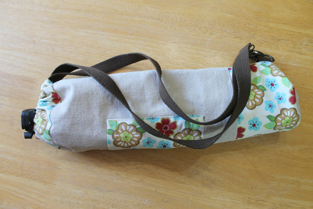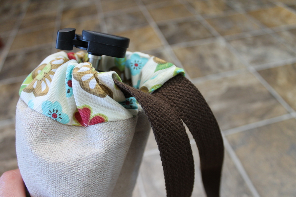 See how my tripod top peeks out the top.  That's what I wanted to make it easier to pull out and slip in.  The cotton webbing is in a casing here at the top that gives it a snug enough closure.