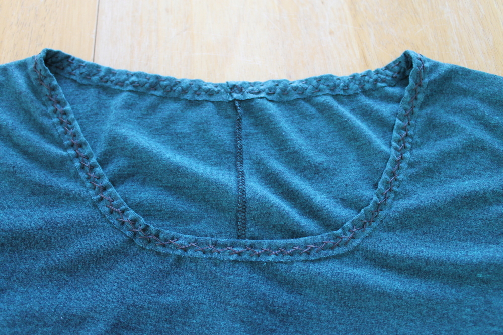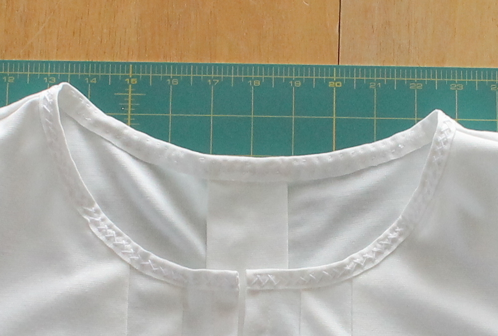 Neckline handstitching in process.  It is so much easier to embroider with the binding longer to the inside.