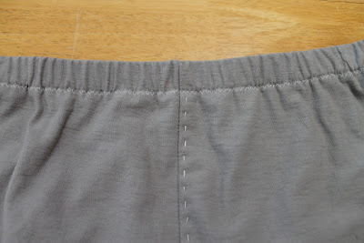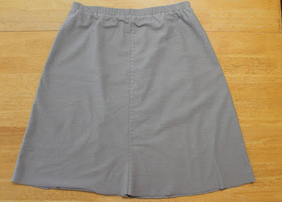 When I got home I cut 2" off the skirt's length and unpicked the stitching at the waistline, cutting off 2" of the elastic to make a snugger fit.  Made a casing for the 3/4" elastic by turning the top down, zig-zagged stitched leaving an opening for the elastic to be run through, then stitched closed.  This is my preferred elastic-waist garment method.  I deviated from Alabama Chanin's instructions of using a foldover elastic at the waist.  This also moved the (wider) hip area of the skirt up higher on my body and gave me a better fit.  These skirts are designed slim.