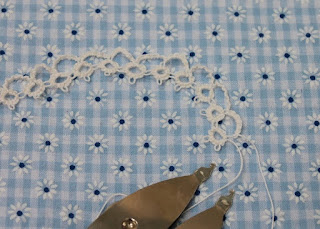 Purchased 2 1/2 yards of 100% cotton pale blue gingham with raised little white daisies, 63" wide at Joann for 50% off $14.99/yard. Nothing, not even scraps are left over. This dress cost $18.75 to make. I did not add the pre-planned tatting after all.