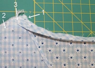 Since I seemed to be on an Ottobre roll, decided to finish the back neckline also the same as the Sculpture No. 10 tops. Cut 1" bias binding for the back neckline. Thought I'd try to show you here a little of how Ottobre has you attach the back neckline binding. You first finish the front neckline, then sew the back neckline binding, right sides together 1/4" seam allowance #1, below. Then you stitch the shoulder seams, being careful not to catch, or stitch on the neckline binding #2, below. Then you fold over the (right-side) neckline binding edge to the front shoulder seam, and stitch on that seamline #3, below.... then turn it right side out and top-stitch down..... and voila'.... the seam is enclosed with little bulk.