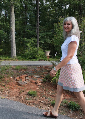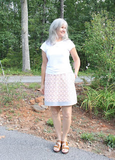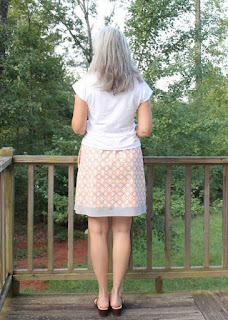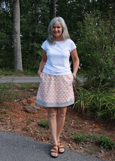 This pattern is so easy and simple, it only has 1 pattern piece for the front/back. My fabric is another purchase from Wal-Mart's new fabric line of 100% cotton, 43" wide at $4.98/yard. I only purchased 1 yard of fabric to make something else and sort of switched gears here. This pattern requires 1 1/2 yards, so I decided to make the amount of fabric I had 'work'..... and feel I've created a much better garment overall than if I'd had enough fabric to begin with. What I finally came up with: the casing for the 1" elastic is made out of a soft white knit.... the fashion fabric with a band of gray jersey knit (leftover from my Alabama Chanin 4-panel skirt) ... lined with 100% white cotton sewn in as an underlining, not as a traditional lining. The white knit casing does not bother me as no shirt will ever be tucked in. Also, the knit is soft against the skin, which is nice.