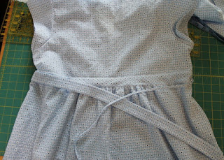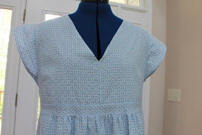 This dress has been planned since June. Temps have consistently been 97 degrees since mid-May..... through June AND July, which is most unusual for this area of South Carolina. August is usually our 97 degree month. The dress is done..... our temps have hovered around 82 degrees since the first of August..... every.... day..... with today raining and cool. NOT the weather I'd made this dress for. *sigh* At least it will be ready to wear and (feel like new!) for NEXT summer. :)