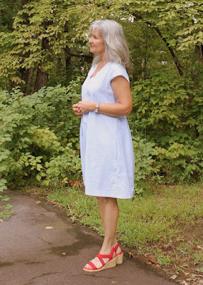 Overall I like my new dress, but not sure if I will make it again. This is a completely different style for me than I've ever worn, so that has taken a little getting used to. The shoes helped..... a lot. At first I was afraid it looked nightgown-ish.... but the red wedge shoes really 'make' the outfit.... to me. Also wondering if I can shorten it a little more and that'd help?