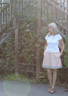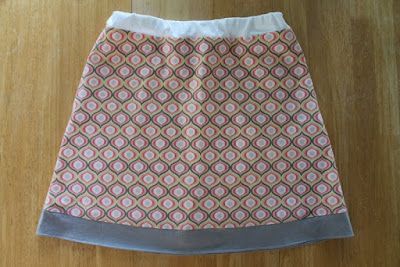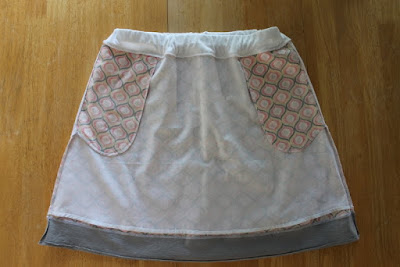 A peek at the bottom insides. I cut the white underlining off at the top of the gray knit band and sewed a small baby hem. I didn't want the knit to look 'stiff'. The knit hem was barely turned up and machine straight-stitched. The skirt runs on the short side.