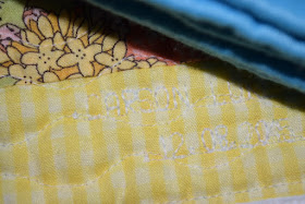 Oh, and I embroidered the little boy's name and date of birth at the bottom of the quilt to personalize it for them. The white thread did not show up well at all against the yellow gingham, but that's okay as I wanted it to be there without standing out.