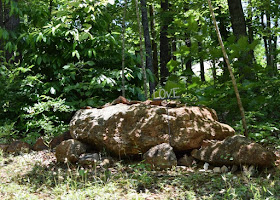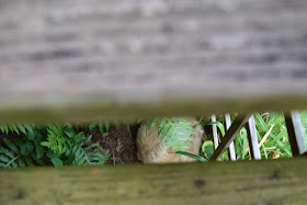 .....Buster has found a most perfectly cool place to spend the day! Under our front deck's julienne stairs, Tom has planted a fern and bracken 'Secret Garden'. There's a few Solomon Seals and Merry Bells in here too...... :)