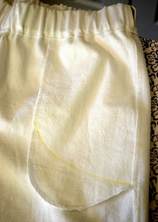 After making the entire pair of pants, the pockets really, really bugged me as you could see them sort of bulging through my white twill fabric.  Thinking ahead, I'd made the pocket bags out of 100% soft white quilting cotton to reduce bulk, but it was still not working for me.  So I decided to shorten the pockets and cut off the 'bulging' part as you can see below.  I made an angle and wheel traced it to both pocket bags, so they'd both be even, then cut them off and re-serged that area.  Super happy with the results.  Also, in the photo below, you can see the construction of the simple elastic-waist and the channel area I leave open at the side seam for the elastic insertion.  I've gotten to where I do not close this up when completed just in case I might need to go in and shorten my elastic someday.  Positive thinking, right?!